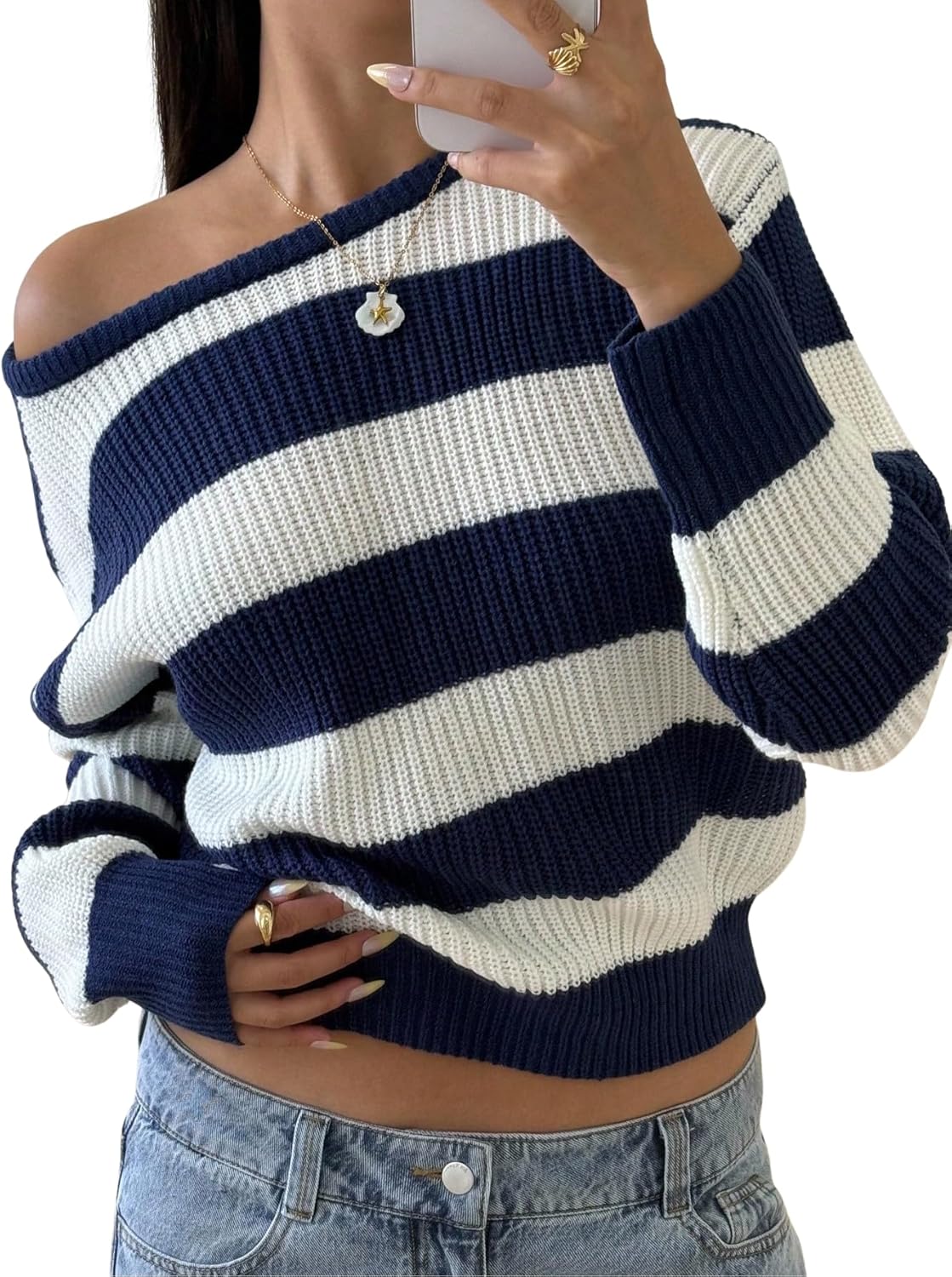 Verdusa Striped Off The Shoulder Sweater Oversized Sweaters Long Sleeve Y2K Loose Knitted Pullovers