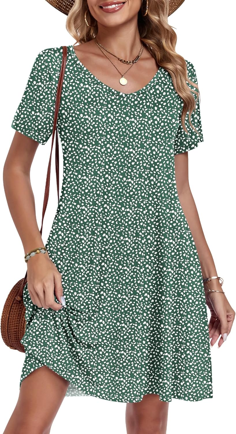 AUSELILY Tshirt Dress Women Swing Floral Short Sleeve V Neck Vacation Beach Mini Dress with Pockets