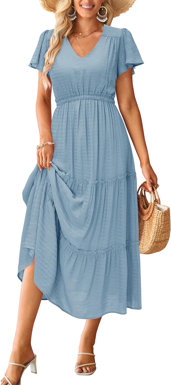 VOTEPRETTY Women's 2026 Summer Boho Maxi Dresses Flutter Short Sleeve V Neck Casual Beach Wedding Guest Vacation Long Dress