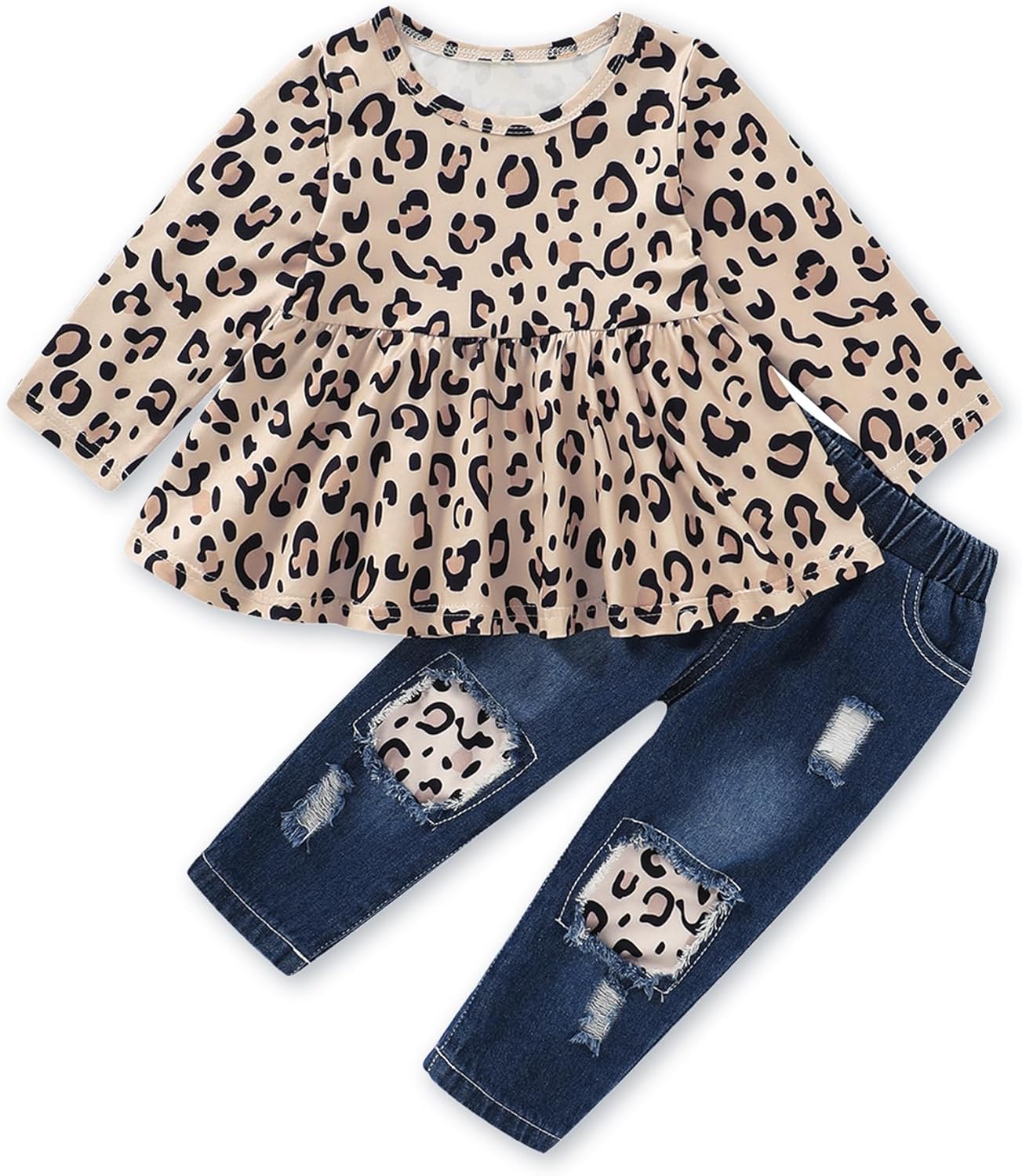 NZRVAWS Toddler Baby Girl Clothes Infant Print Colorful Ruffle Outfits Fall winter Top Ripped Jeans Pant Set Clothing 6M-5T