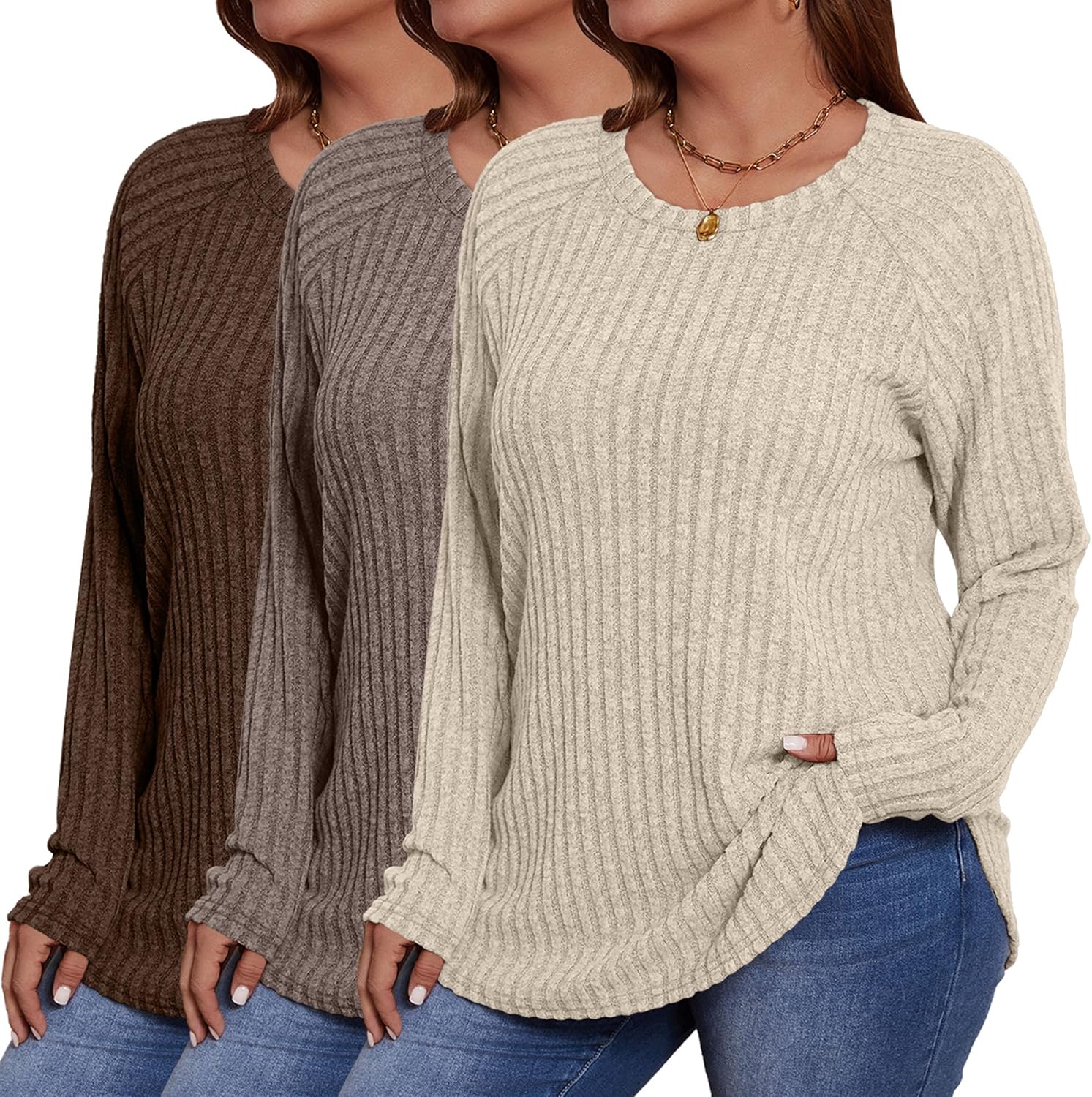 Ficerd 3 Pack Plus Size Tunic Tops for Women, Long Sleeve Women's Sweaters Curved Hem Side Split T-Shirts Crew Neck Pullover