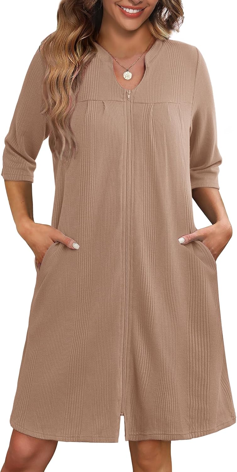 Ekouaer Zipper Robes for Women 3/4 Sleeve Waffle Knit Bathrobe Lightweight Short Housecoat with Pockets Soft Loungewear S-3XL