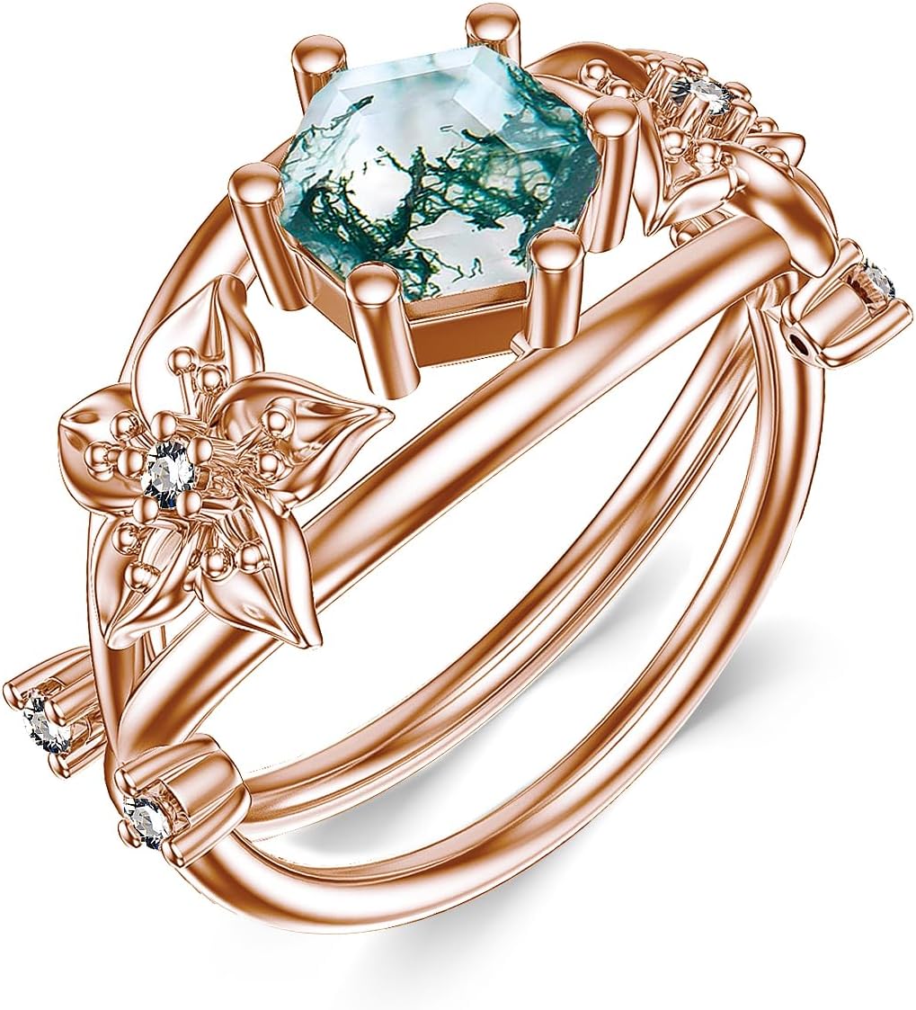 925 Sterling Silver Hexagonal Natural Moss Agate Engagement Ring for Women Stackable Promise Rings Flower Jewelry Set Rose Gold Plated