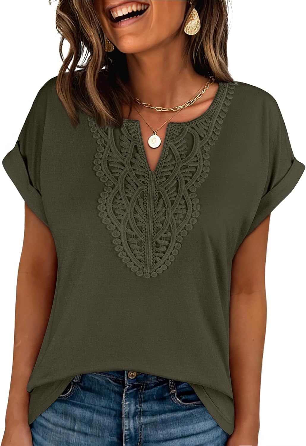 ANRABESS Womens Short Sleeve Tops Boho V Neck Lace Shirts Dressy Casual Blouses Summer Cute Tunic 2026 Trendy Fashion Clothes