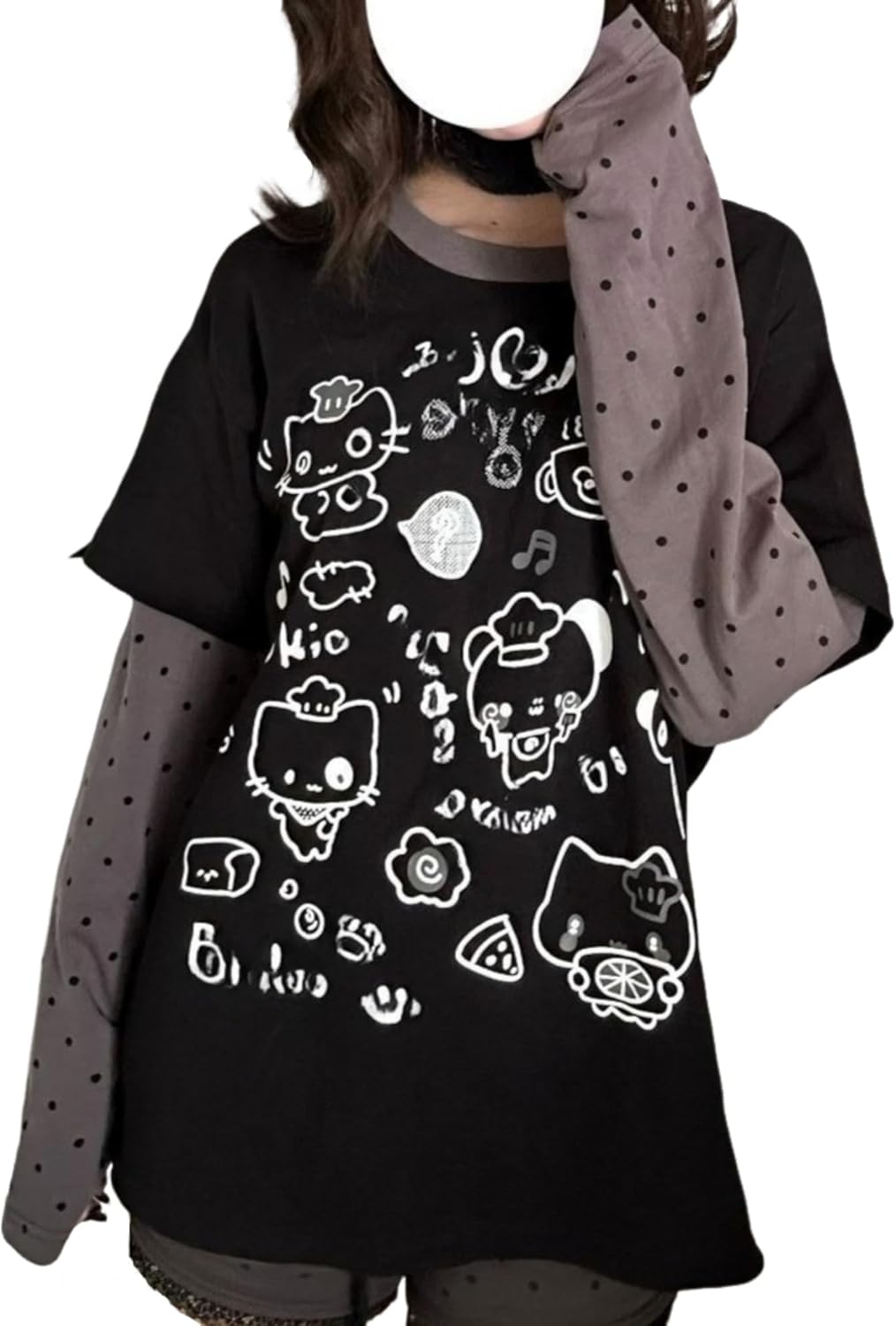 GGOOB Y2k Fake 2 Piece Cute Shirts Women Kawaii Cutecore Graphic Long Sleeve Top Teen Girls 2000s Preppy Aesthetic Clothing