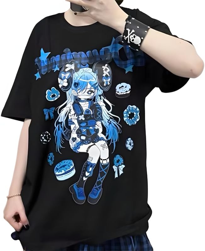 Y2K Gothic Harajuku Kawaii Clothes Casual Loose Soft Crewneck Cartoon Anime Doughnut Girl Print T-Shirt