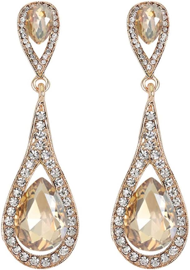 Gold Tone Antique Vintage Retro Deco Gatsby Flapper Style Champagne Amber Yellow Citrine Zircon Rhinestone Pear Dangle Earrings