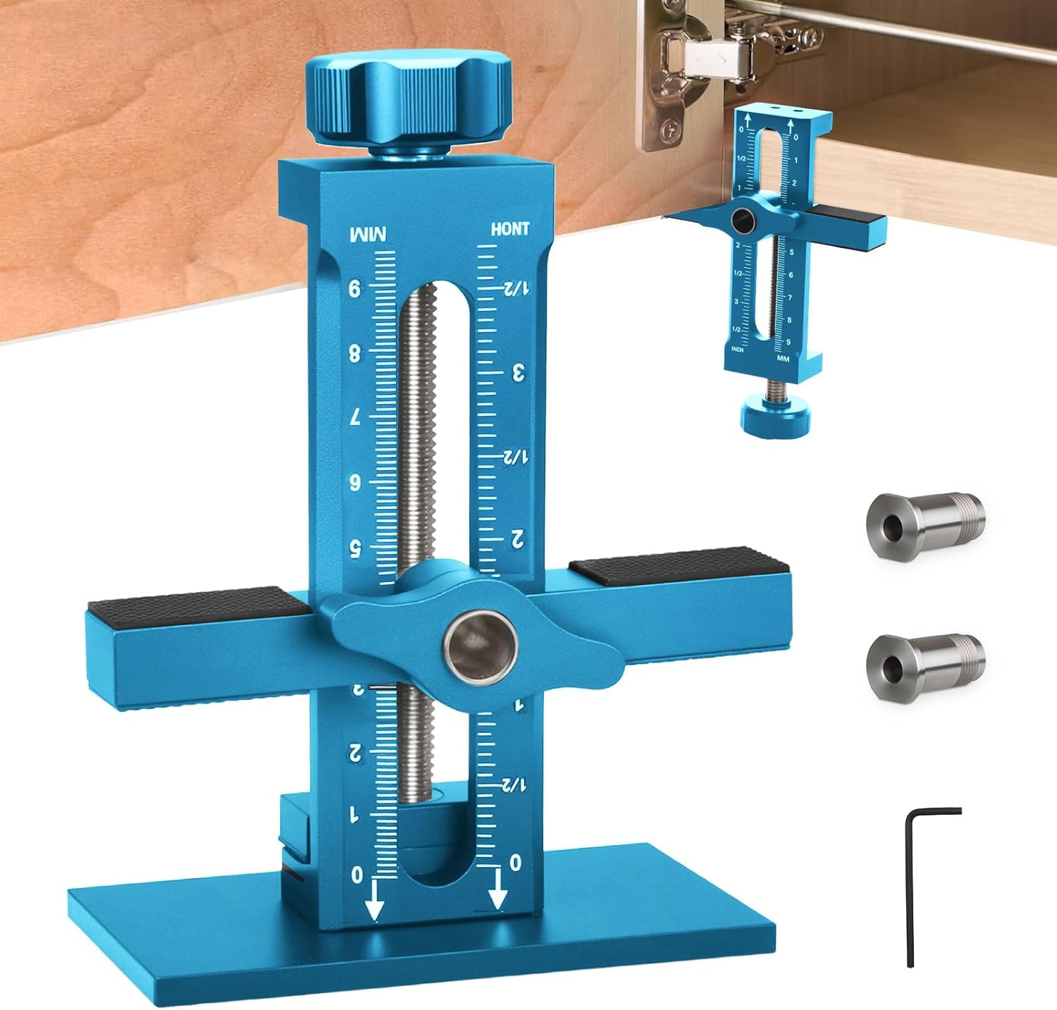 - Drillable Design: The cabinet door installation jig features a drillable design, allowing for easy addition of anti-pinch or silent devices. The 10mm holes are compatible with most drill bits, and the vertical rod adjustment function ensures precise alignment during drilling, enabling you to complete projects with professional-grade precision.