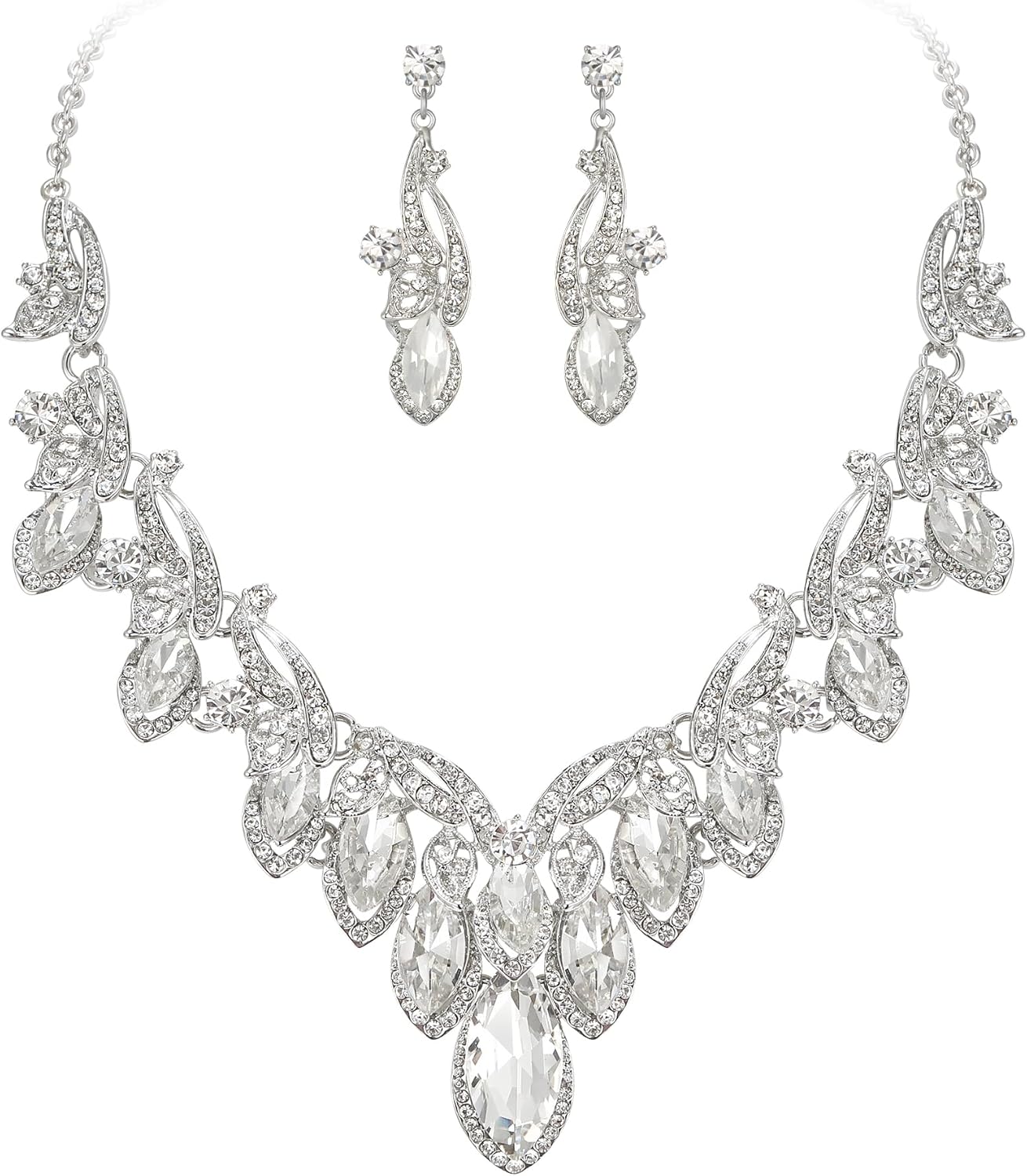 BriLove Women's Wedding Jewelery Set Leaf Flower Shiny Gorgeous Marquise Crystal Cluster Pendant Necklace Dangle Earrings for Bridal Party Prom Accessories