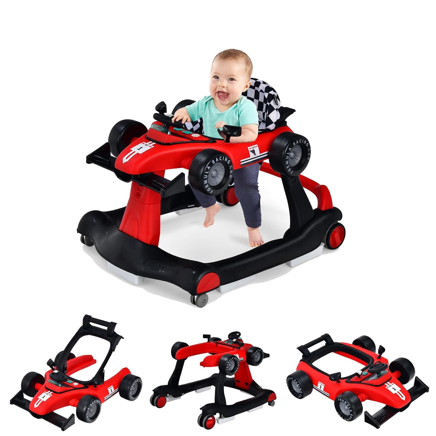 - [4-in-1 Multipurpose Baby Walker]: Our baby walker with wheels features a race car-inspired look with 4 modes in one, including baby walker mode, push-behind mode, push car mode and rolling toy car mode. Designed for infants aged 6-18 months, baby maximum load 25lbs.