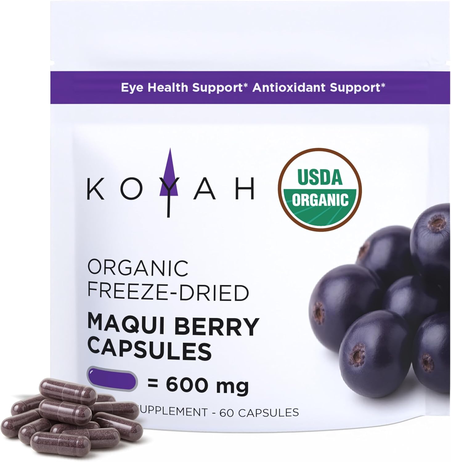 KOYAH - Organic Maqui Berry Capsules - Freeze-Dried, Whole-Berry, 600 mg, Vegan, Gluten-Free, Non-GMO. Eye Health Support. Antioxidant Support. 60 Capsules