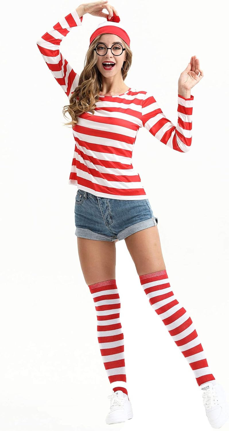 Women Red/White Striped shirt Hat and round eye glasses Halloween Costume Set…