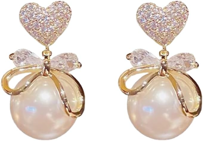 Heart CZ Pearl Drop Earrings for Women, Gold Plated Bowknot Dangle Earrings, Elegant Shiny Faux Pearl Stud Earrings, Hypoallergenic Wedding Party Jewelry Gift for Women