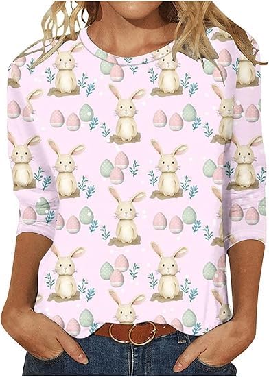 2026 Easter Shirts for Women Funny Bunny Egg Graphic Tees Cute Festival Outfits 3/4 Sleeve Tops Cotton T-Shirt Gifts