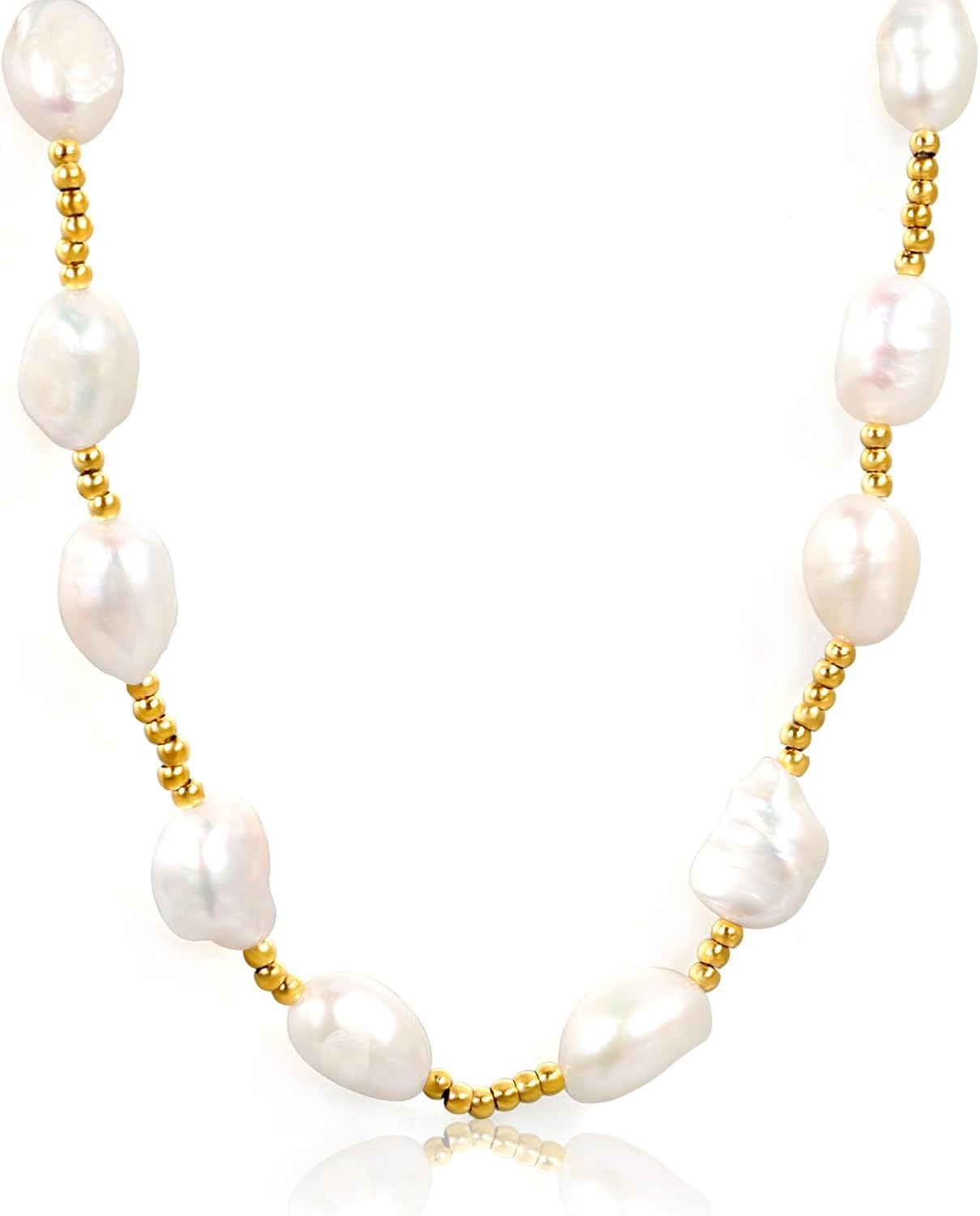 Baroque Pearl Necklace for Women, Freshwater Pearl Beaded Jewelry with 18K Gold Plated 316L Stainless Steel Beaded Chain Statement Choker, Boho Irregular Dainty Vintage Jewelry Gift