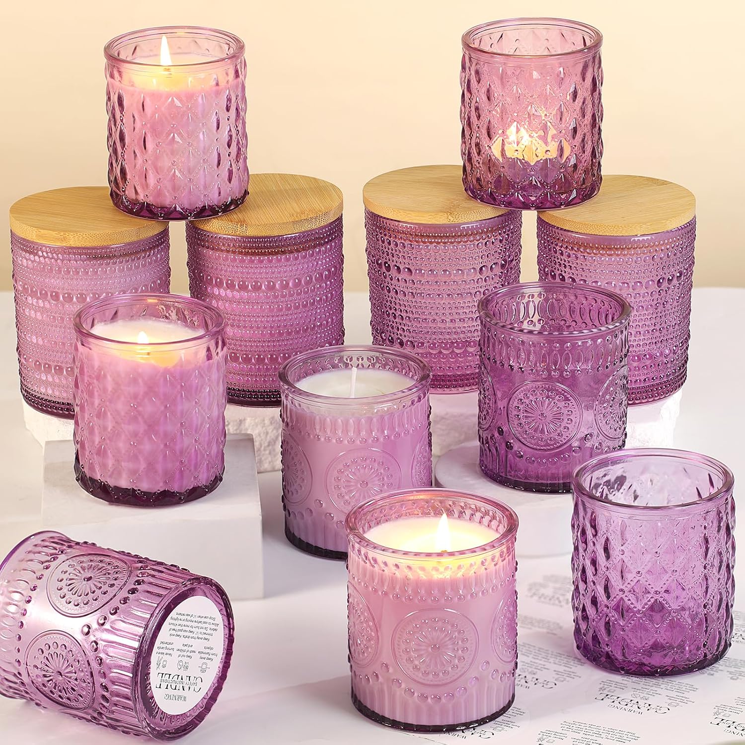 DARJEN 12 Pack Purple Candle Jars for Making Candles- 3 Styles Glass Candle Making Jars Bulk with Bamboo Lids and Labels, Candle Making Supplies Candle Vessels for Home Decor