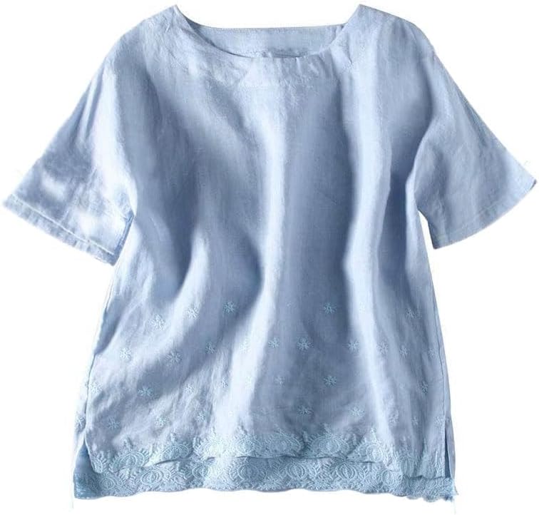 Minibee Women's Summer Linen Tunic Shirt High Low Hem Embroidery Blouse Top
