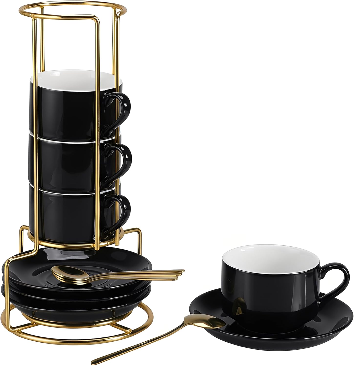 3 Ounce Espresso Cups Set of 4, Stackable Demitasse Mugs, Includes Display Stand, Cups Saucers, and Spoons, for Machines & Home Use, Black, Gold Tone