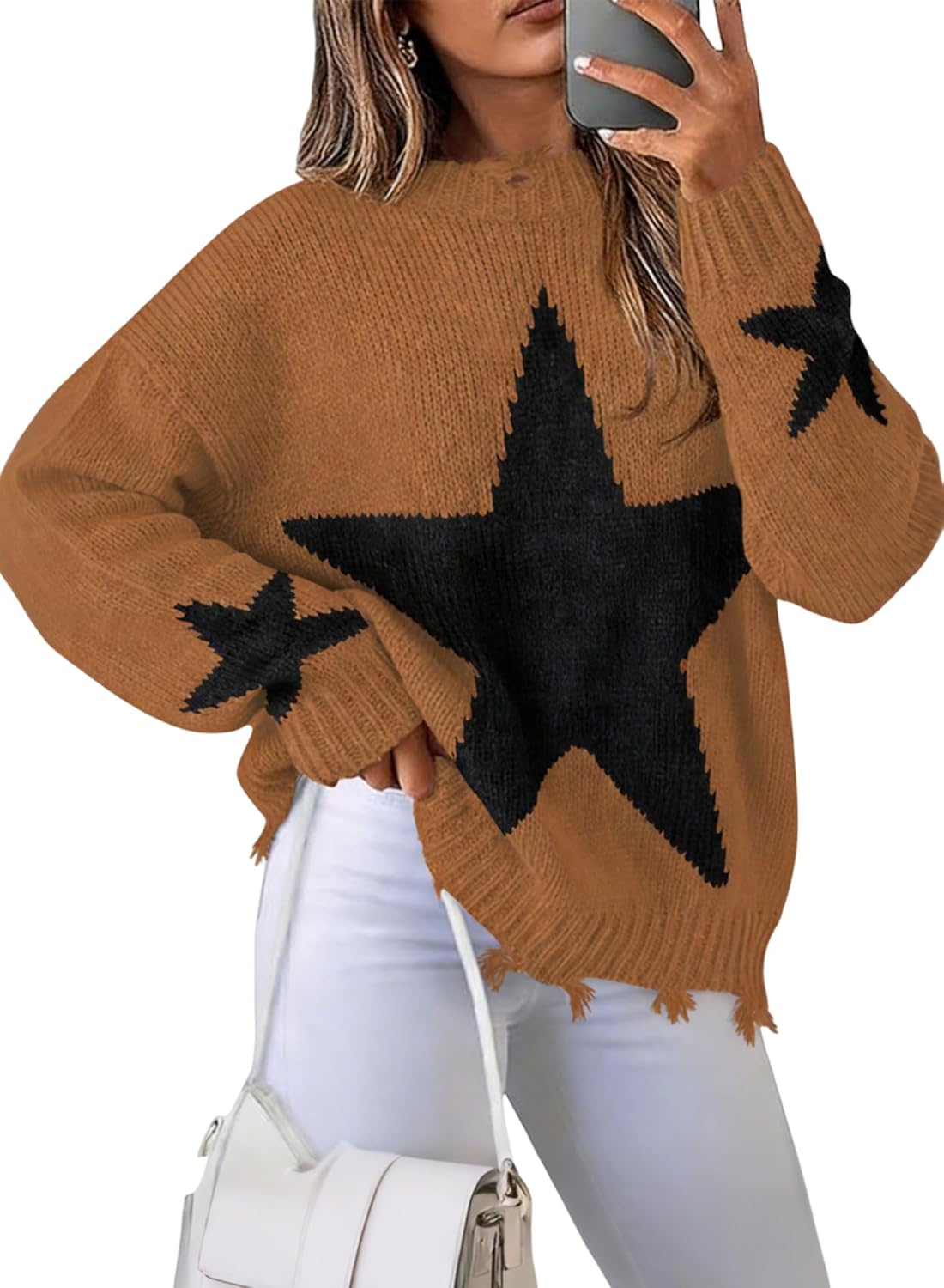 Women Sweater Fall Star Pullover Long Sleeve Crewneck Casual Cute Sweaters Tops