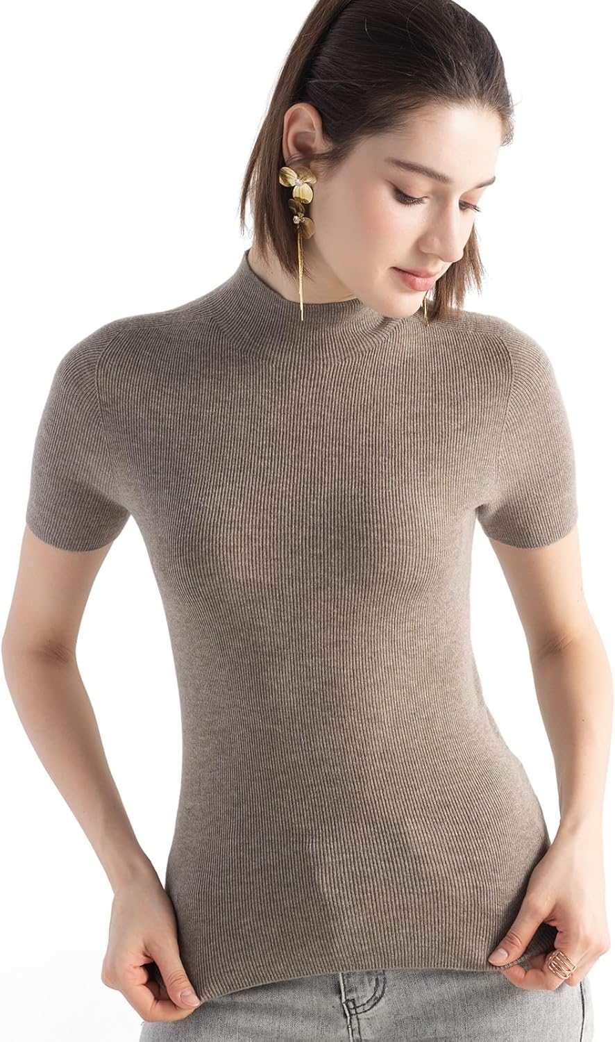 Women's Merino Wool Blend Sweater Mock Neck Rib Slim Fit Short Sleeve First-Line Ready to Wear Seamless Knit Sweater