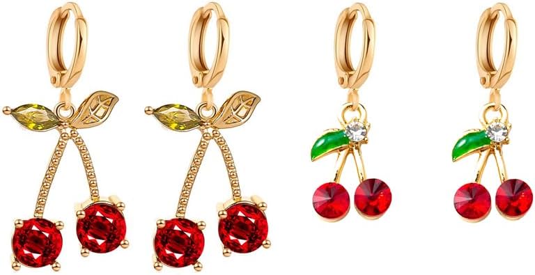 2 Pairs 14K Gold Plated Sweet Red Cherry Hoop Earrings for Women Cherry Green Leaf Drop Earrings 3D Cute Sweet Fruit Earrings Summer Jewelry Gift