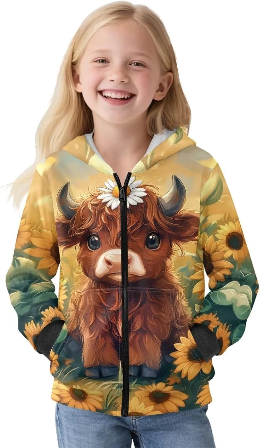 geumidibrlt Girls Highland Cow Hoodies Cute Coat with Cow Print Zip-Up Outerwear Jacket for Kids 3-12Y