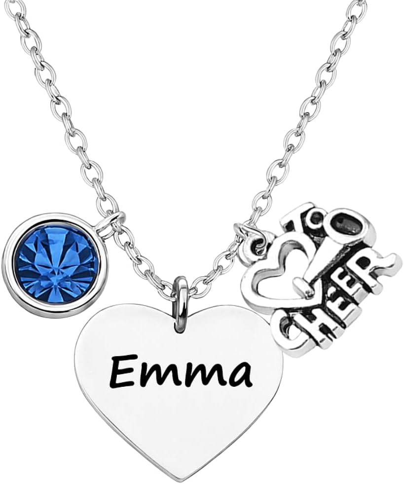 Personalized Engraved Cheer Necklace with Birthstone Charm - Custom Cheerleading Jewelry Gift Non-Tarnish Accessories