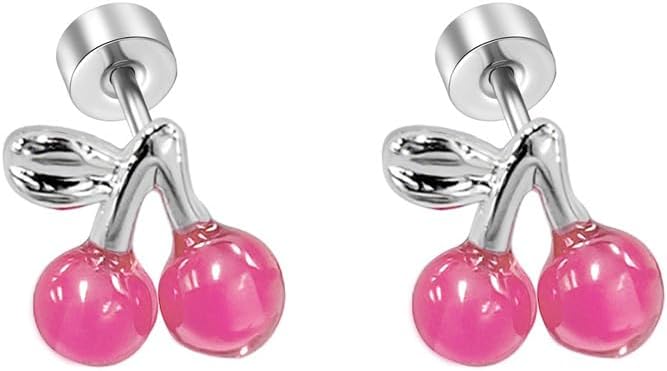 20G Cherry Screw Flat Back Small Stud Earrings for Women Stainless Steel Silver Plated Cute pink Resin Lovely Sweet Food Fruit Cartilage Tragus Piercing Little Studs Hypoallergenic Fashion Jewelry