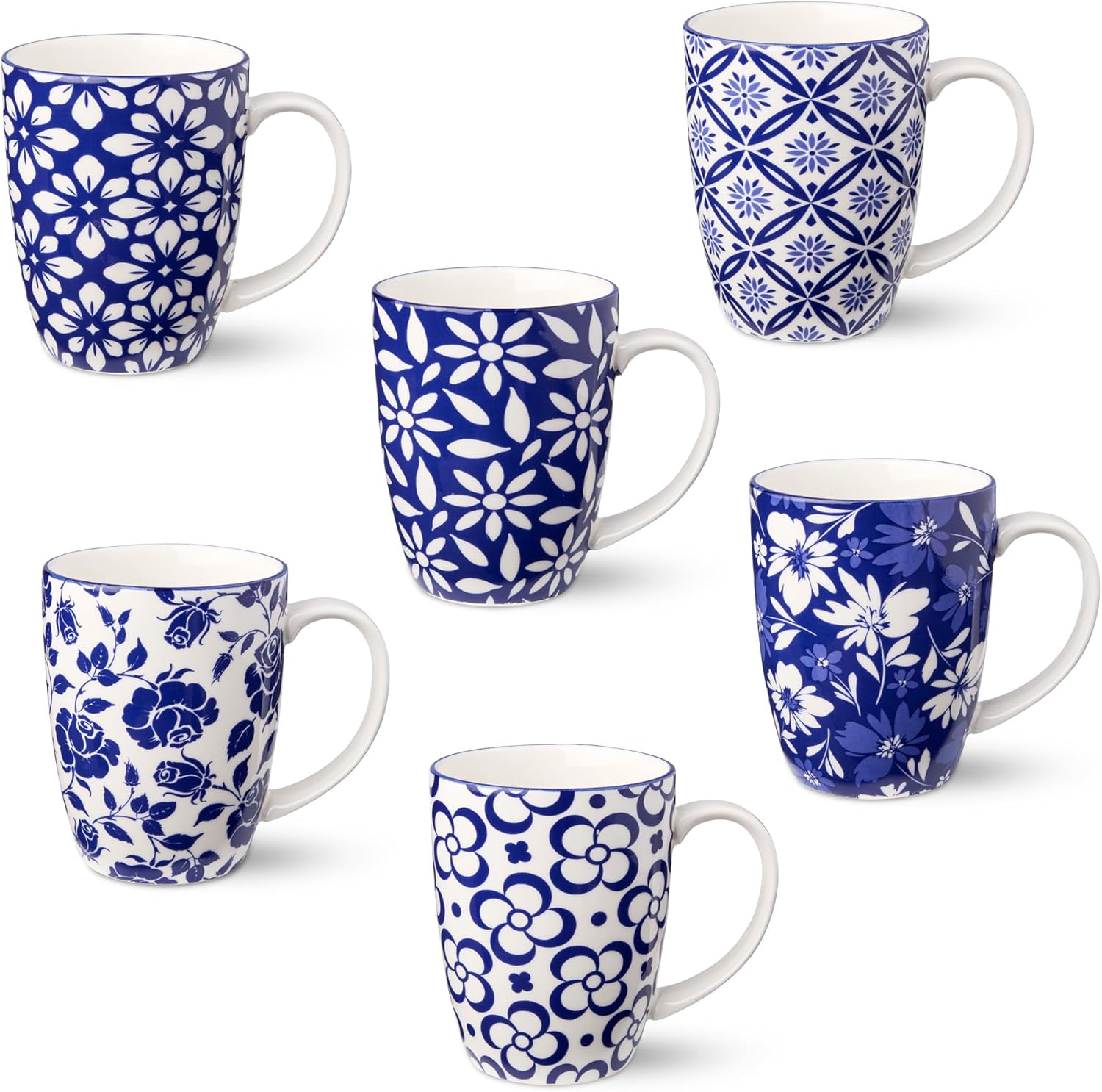 - Featuring six unique 14 oz mugs, this set showcases a stunning mix of intricate floral and geometric patterns. The vibrant blue and white designs bring timeless charm and artistry to your drinkware collection, making every sip special.