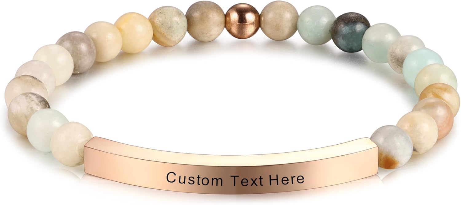 MeMeDIY Personalized Bracelets for Women Natural Stone Stretch Bracelet Stainless Steel Bar Engraved Name Inspirational Message 7.5" Beaded Stretch Bracelet