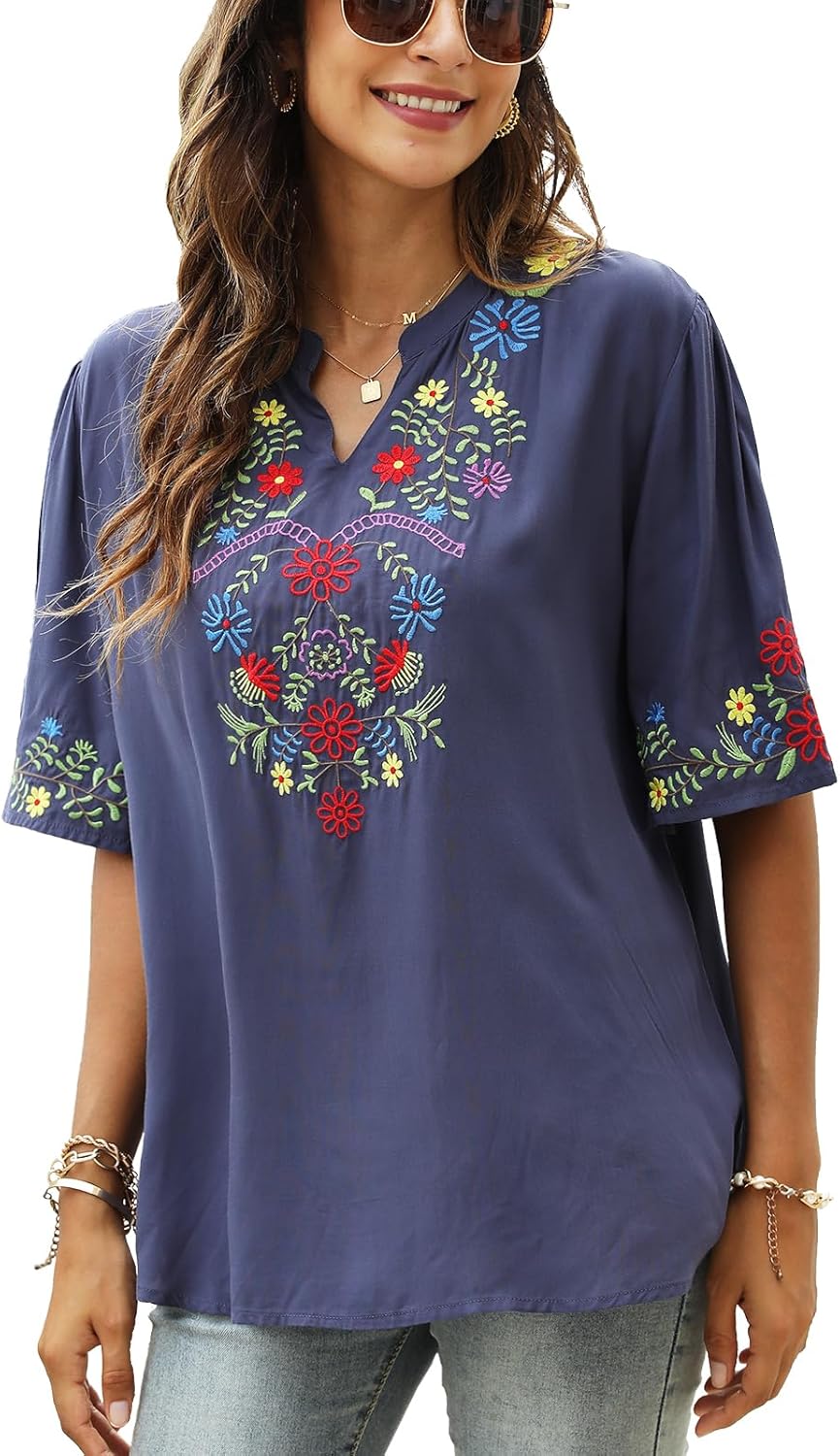Higustar Women's Mexican Embroidered Tops Boho Floral Peasant Shirt Bohemian Traditional Clothes Fiesta Tunic Blouse