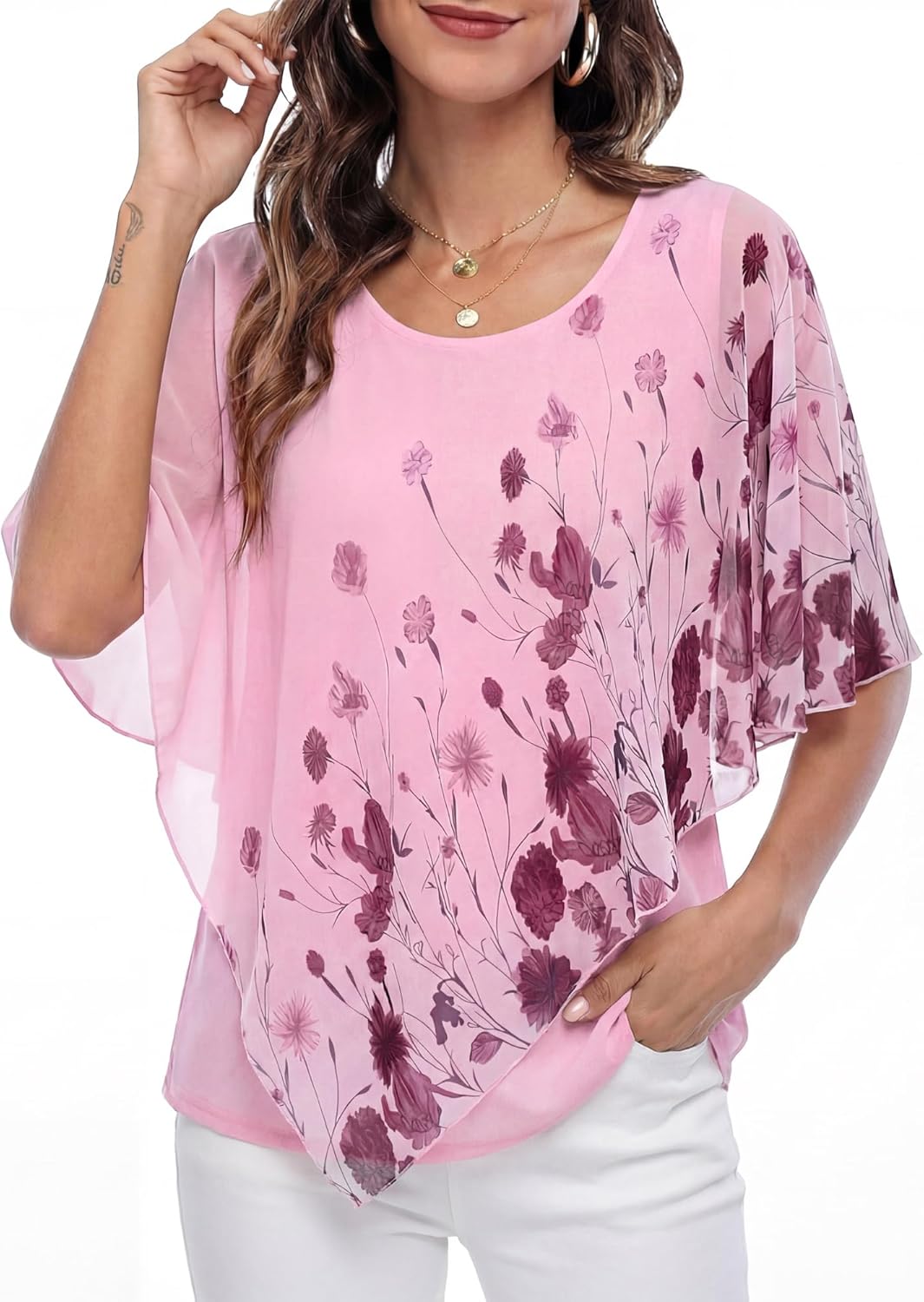 Lotusmile Women's Lightweight Flowy Shirt Double-Layered Printed Chiffon Poncho Blouse Top