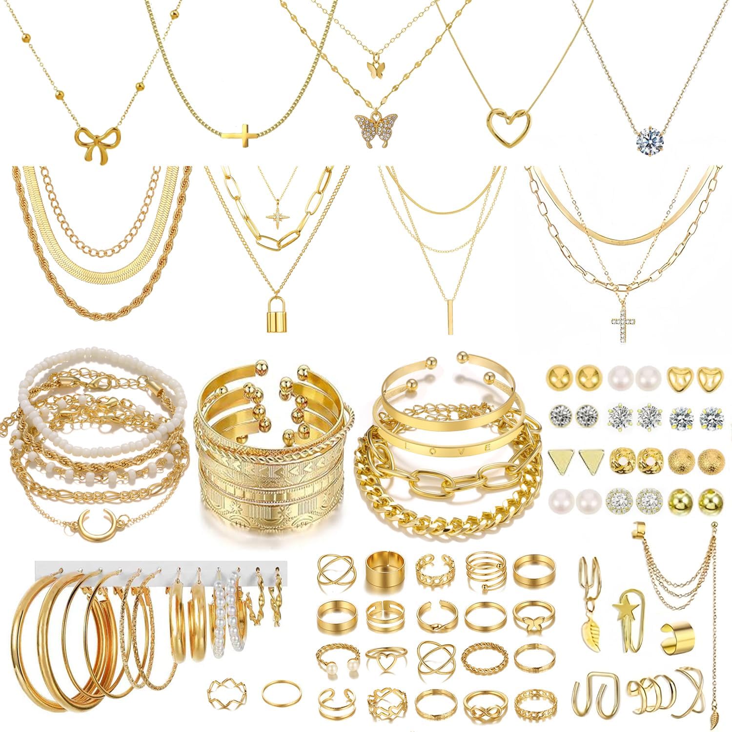 92 Pcs Gold Jewelry Set for Women-Includes 9 Layered Necklaces,16 Bracelets,43 Hoop|Stud|Cuff Earrings & 22 Knuckle Rings |Fashion Jewelry Gift Set