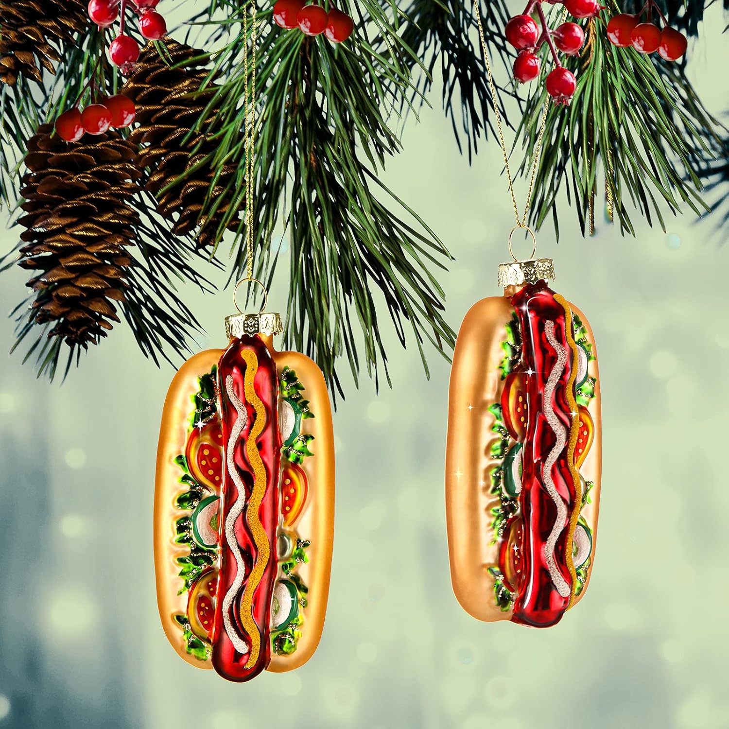 2 Pieces Christmas Food Ornaments Handcrafted Glass Blown Food Ornaments for Christmas Tree Fireplace Decoration(Hot Dog Style)