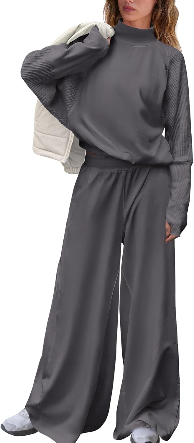Nirovien Womens 2 Piece Lounge Sets Sweatsuits Matching Sweat Sets Hight Neck Sweatshirt and Wide Leg Pants