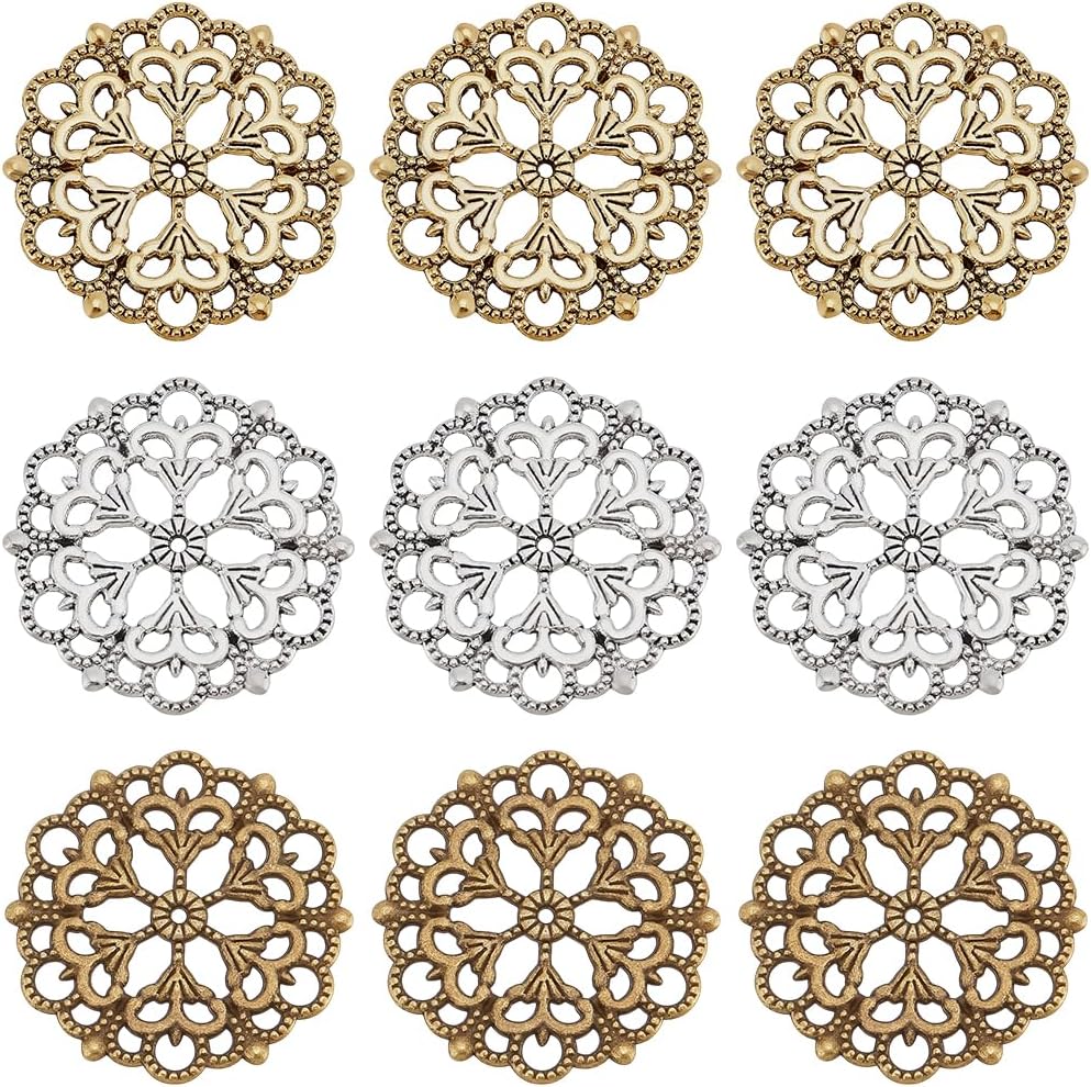 PH PandaHall 42PCS Filigree Connectors Charms Pendants, 3 Colors Rhombus Flower Charms Tibetan Metal Filigree Embellishments Hollow Pendants for DIY Hairpin Headwear Earring Necklace Jewelry Making