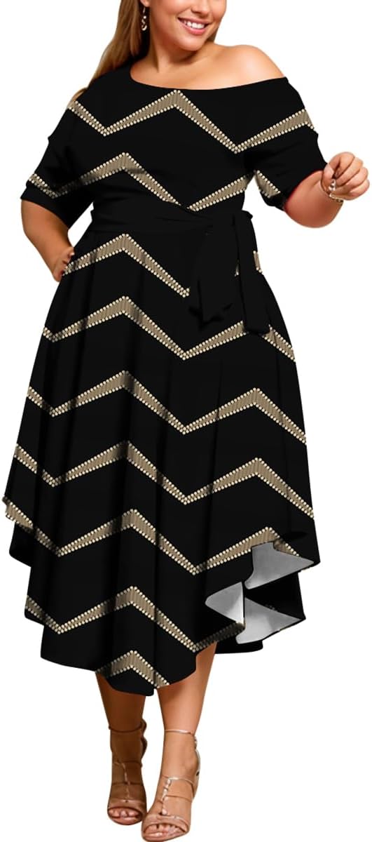Plus Size Women Wedding Guest Dress Off Shoulder Boat Neck Irregularly Flowy Midi Church Dress
