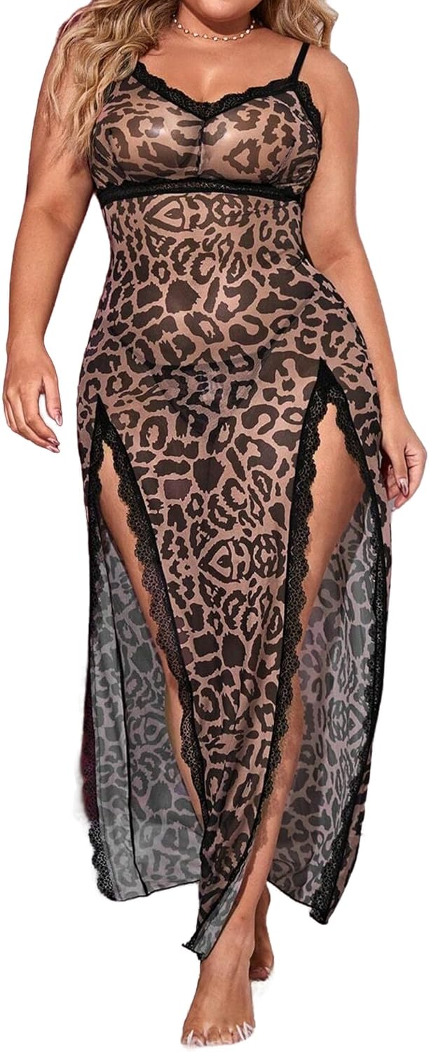 Hilinker Womens Plus Size Leopard Mesh Lingerie Dress Split Long Slip Lace Trim Chemise Nightgown