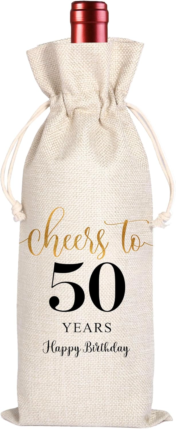 50th Birthday Wine Bag, 50th Birthday Gifts for Women Men, 50 Year Old Birthday Gift Party Supplies, Fifty Birthday Gift Idea Wine Bag for Her Girl Friend Sister (Beige-50th, 13.5 x 5.5Inches)