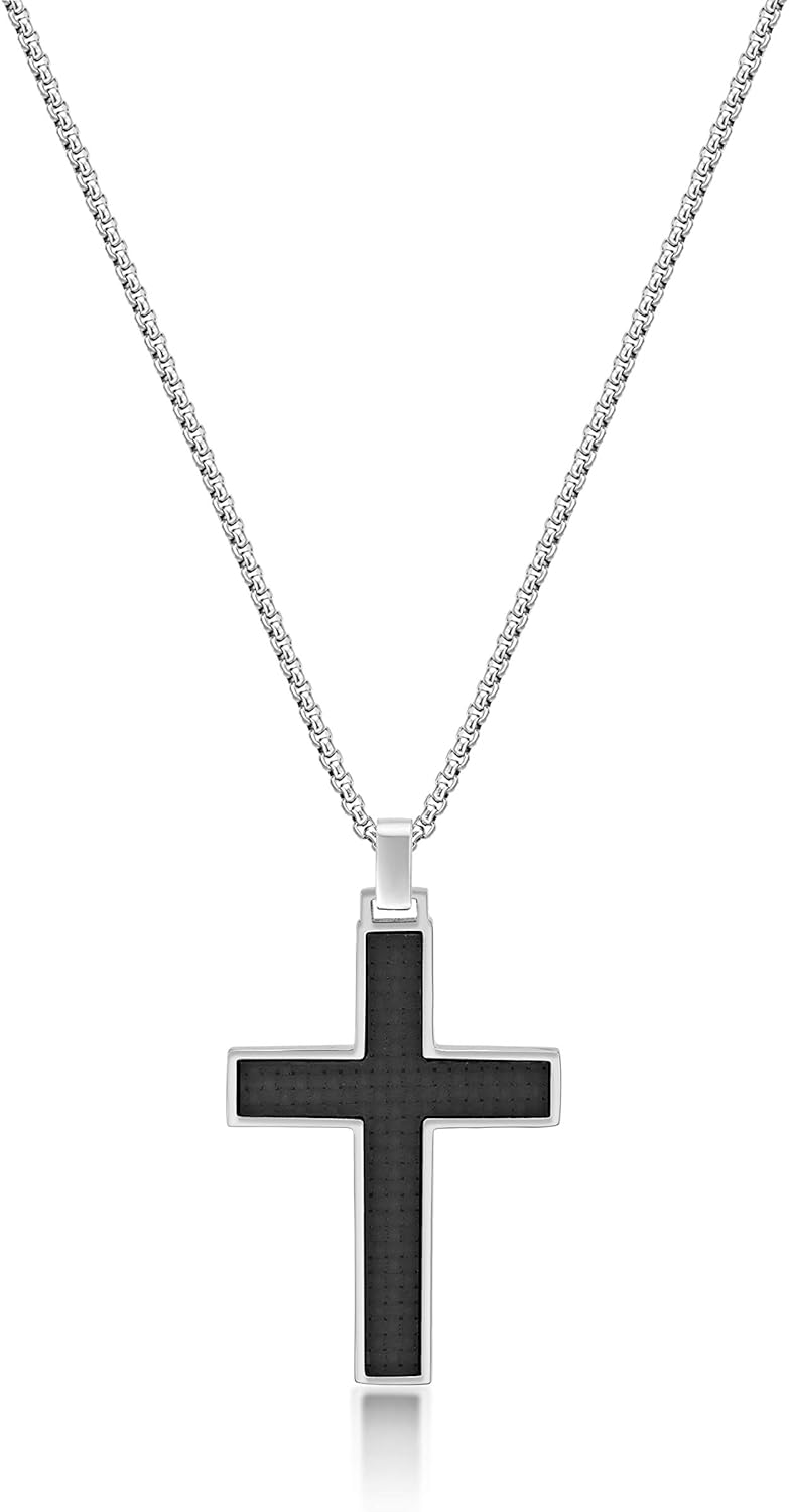 Metro Jewelry Timeless Carbon Fiber Cross Pendant for Men in Stainless Steel 24 Inches Long Box Chain Lobster Claw