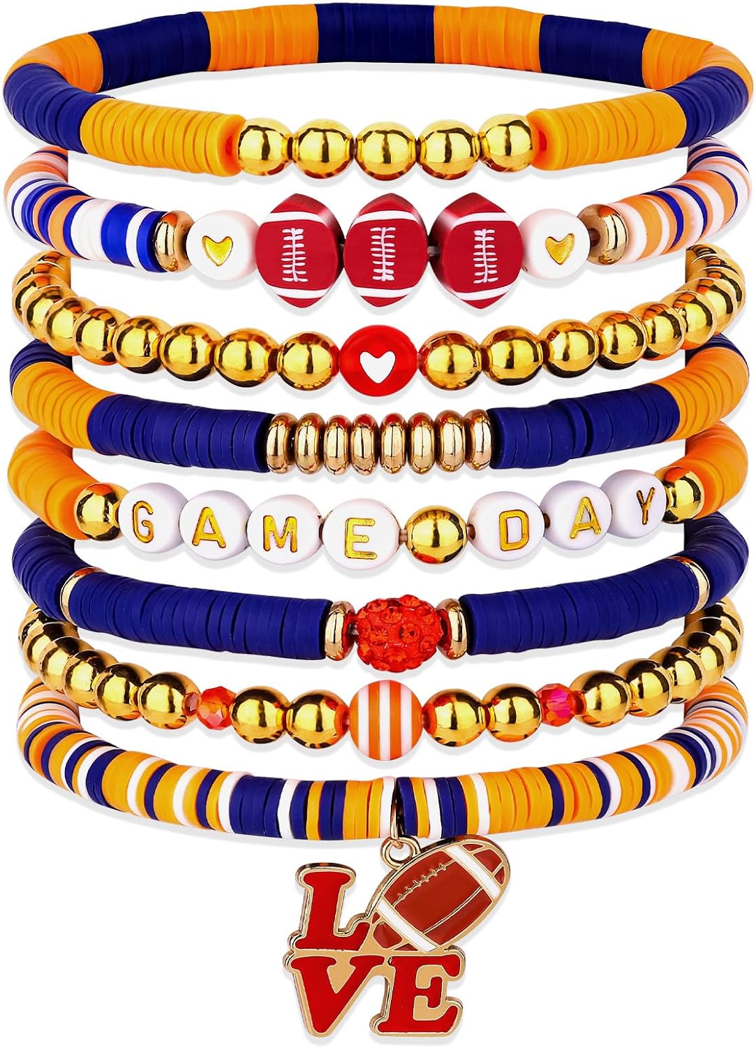 Game Day Bracelets for Women - Red, Orange, Blue Heishi Clay Beaded Stretch Bracelets - Stackable Sports Charm Bracelet Bangles