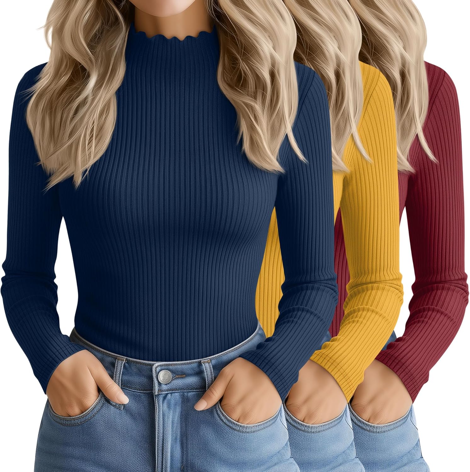 3 Pack Women's Cotton Long Sleeve Mock Turtleneck Tops Ribbed Lettuce Trim Slim Fit Shirts Thermal Base Layer(Dark Blue, Ginger, Wine Red,Large)