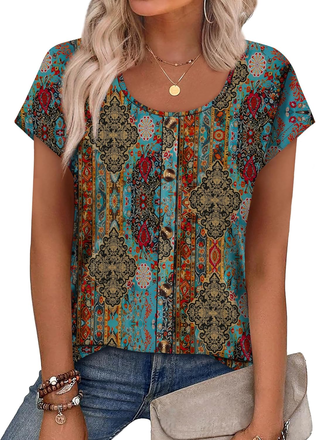 WIHOLL Womens Summer Tops Cap Short Sleeve Shirts Button Down Blouses U Neck T Shirts Fashion Clothing