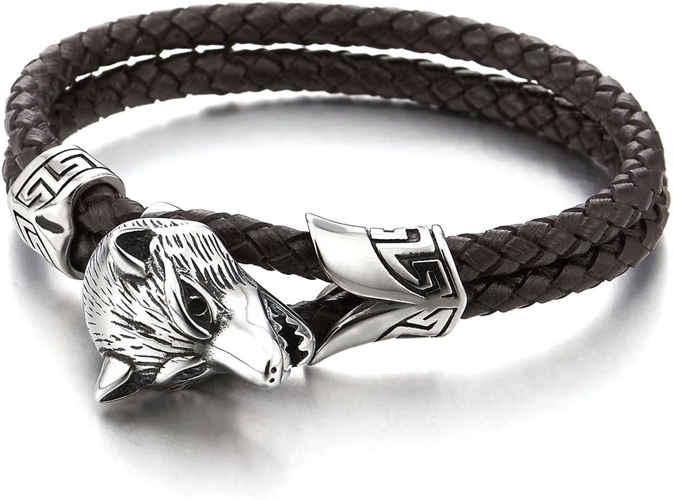 Stainless Steel Mens Wolf Head Bracelet with Genuine Braided Leather