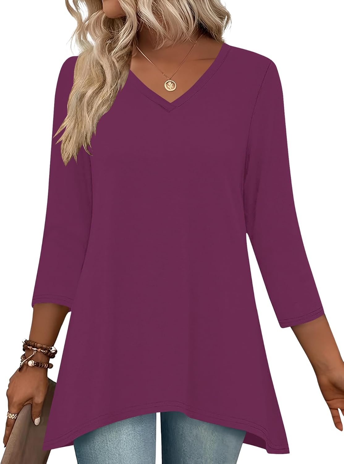 LUYAA 3/4 Length Sleeve Womens Tops V Neck Loose Fit Dressy Casual Blouse Flowy Shirts Plus Size Womens Clothing S-3XL