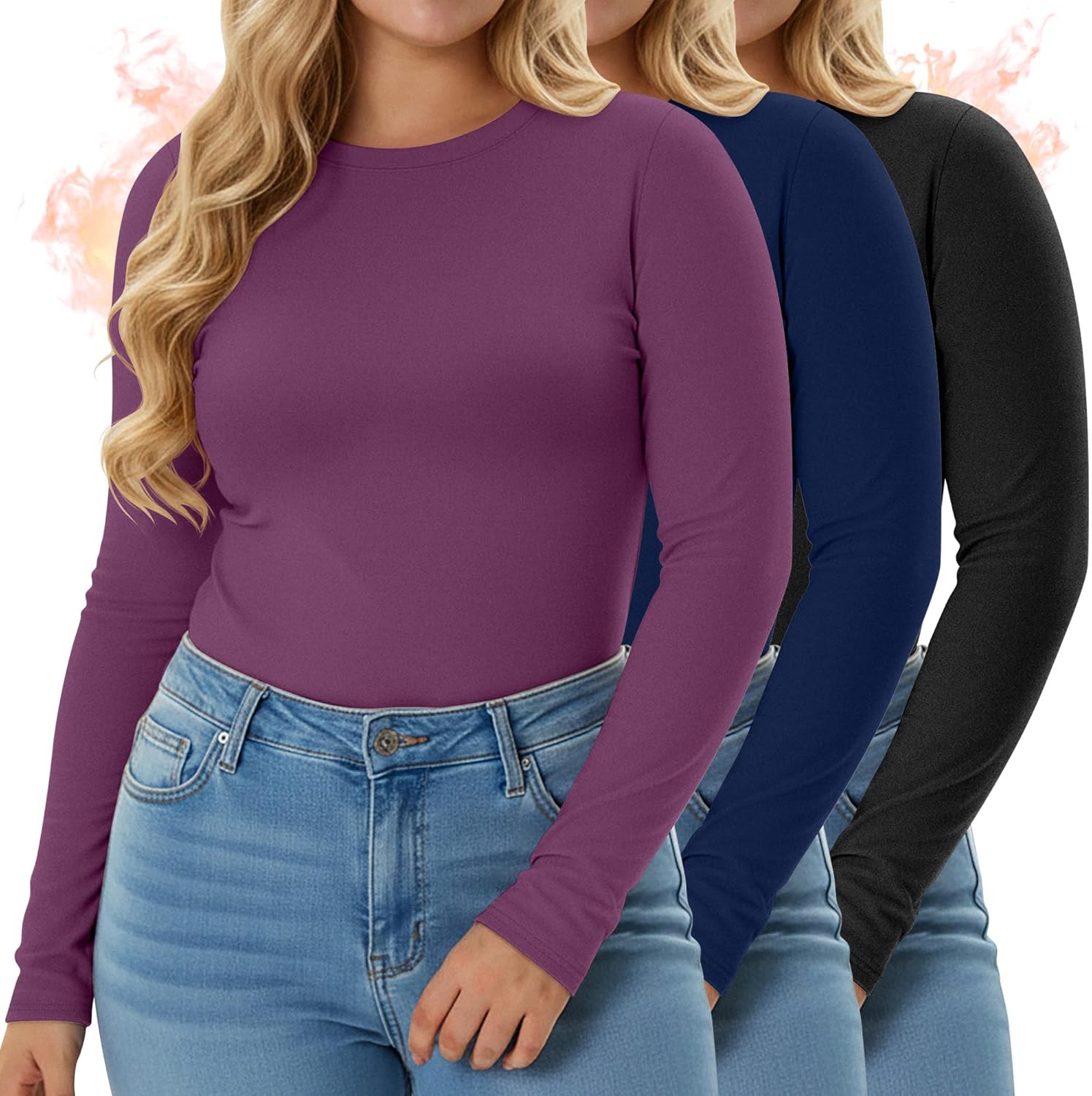 3 Pack Women's Plus Size Thermal Long Sleeve Shirts Slim Fit Fleece Lined Crew Neck Undershirt Tops Cold Weather