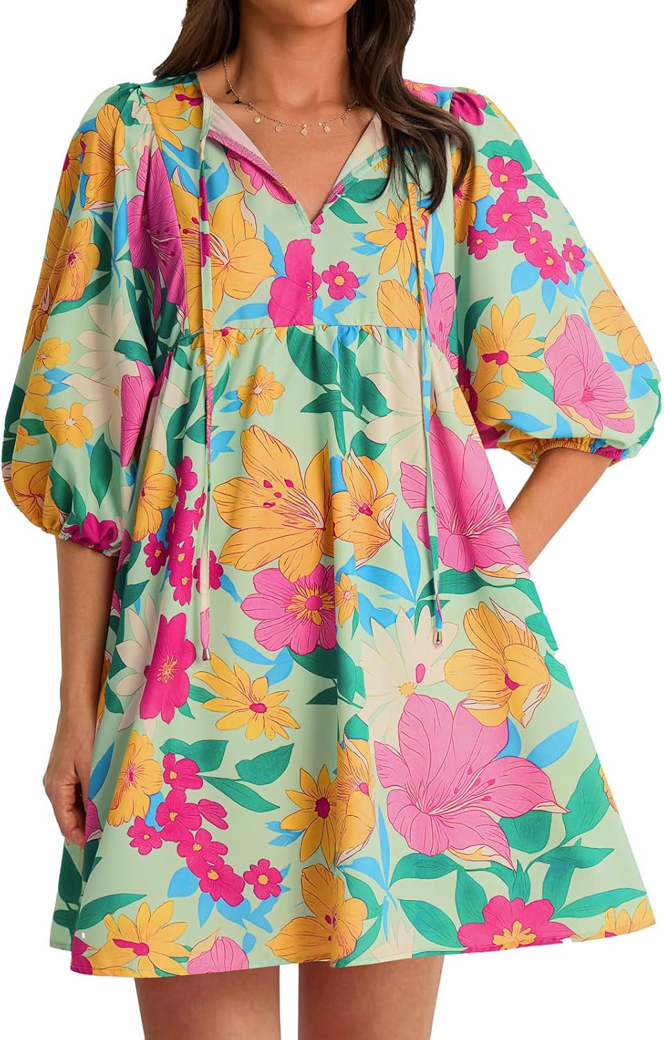 Yousify Womens Summer Dresses Floral Mini Babydoll Dress V Neck Puff Sleeve Loose Fit Boho Beach Sundress with Pockets