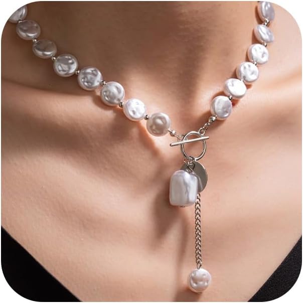 Boho Beaded Irregular Baroque Pearl Choker Necklace for Women Dainty, Trendy Chunky Gold OT Buckle White Pearls Beads Coin Disc Pendant Y Necklaces