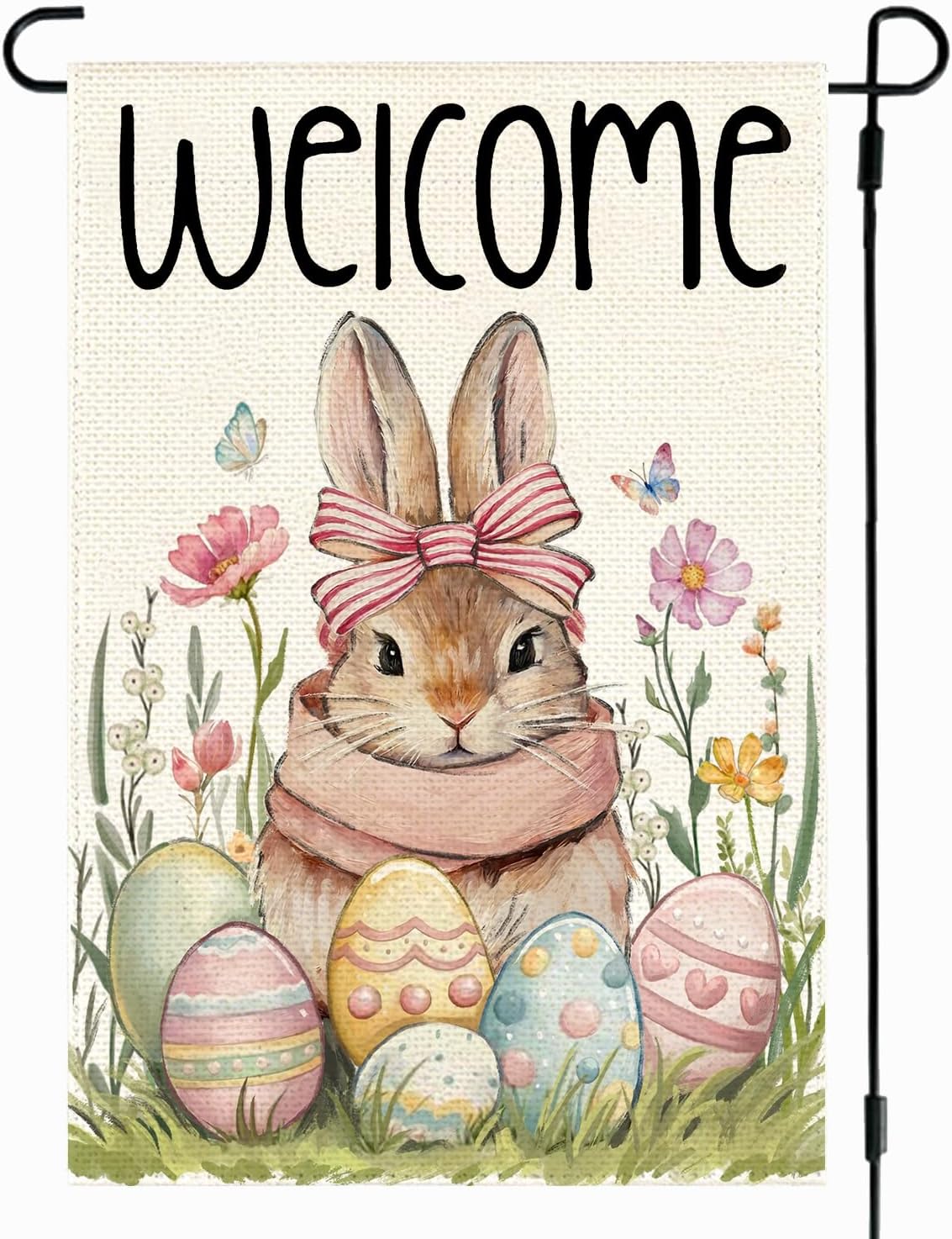RABUSOFA Easter Bunny Garden Flag 12x18 Inch Double Sided for Outside,Welcome Rabbit Eggs Floral Spring Holiday Decoration for Outdoor Small Yard Lawn Flags