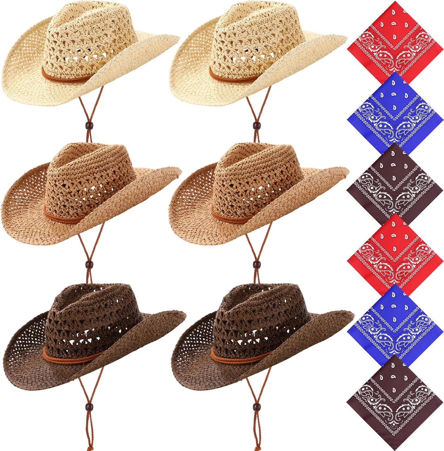 Newcotte 6 Set Straw Cowboy Hats and Bandanas for Women Western Cowgirl Beach Sun Hat Bulk with Windproof Rope for Party Travel